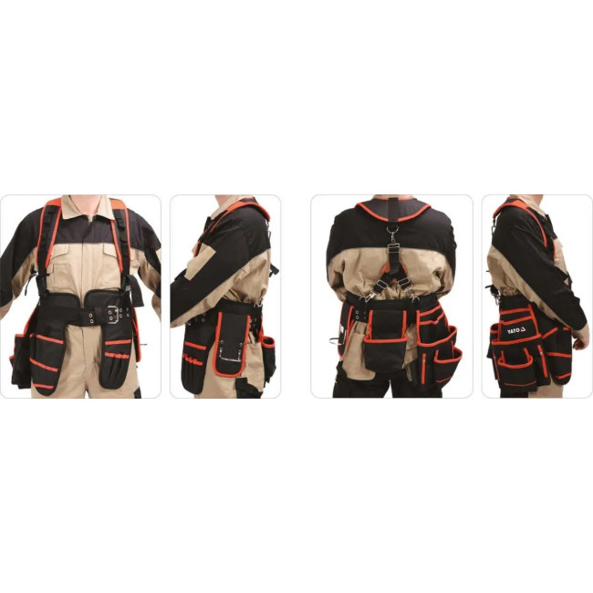 Пояс для інструментів YATO з ременями безпеки, обладнаний двома великими чохлами для електроінструментів, металевим утримувачем молотка та глибокою кишенею для цвяхів або шурупів. Основний ремінь, довжиною приблизно 1280 мм, застібається на міцну металеву пряжку. Він поєднаний з широким ременем для перенесення, який кріпиться на широких лямках. Завдяки такій конструкції навантаження розподіляється рівномірно, зменшуючи навантаження на стегна та перенісши його на плечі. Це забезпечує зручність при роботі з важкими інструментами. Пояс виготовлений з технічної водонепроникної поліефірної тканини OXFORD 600D, що робить його надійним та довговічним. Призначений для зберігання та транспортування інструментів, які використовуються під час монтажних робіт.