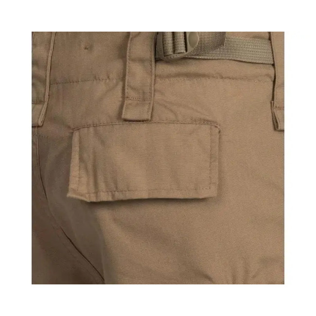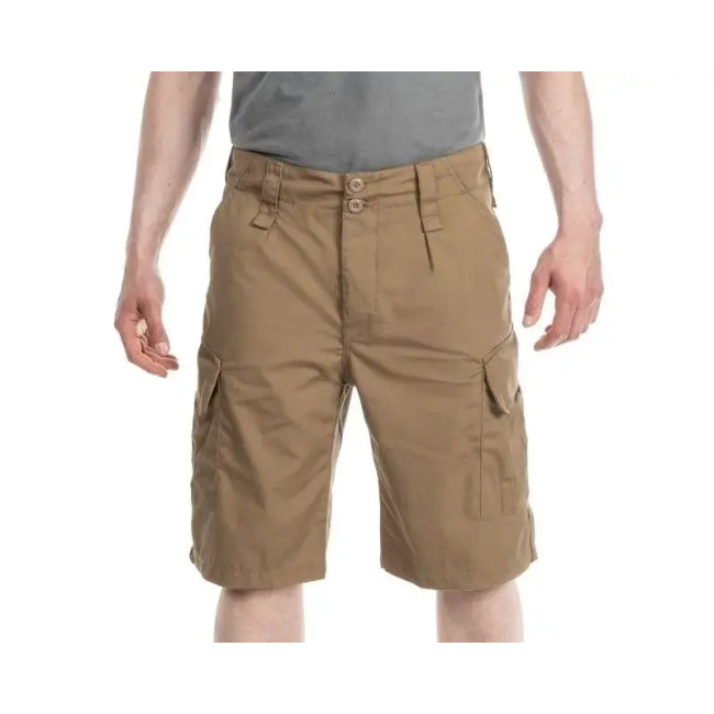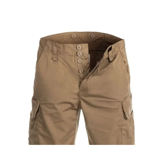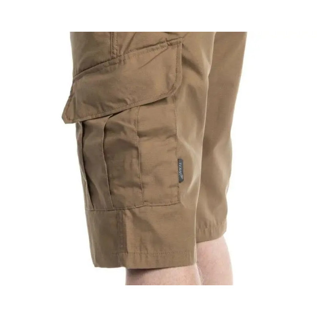 Тактичні літні шорти з додатковими кишенями койот виготовлені із суміші поліестеру та бавовни, тканина міцна, легка і приємна на дотик. У моделі використовується плетіння RipStop, яке підвищує стійкість матеріалу до розриву. Крій штанів із посиленнями на сідницях і промежині забезпечує довгий термін експлуатації. Широкі та міцні петельки для ременя та регулювання на талії на кулісках із пряжкою. Ширінька застібається на ґудзики.