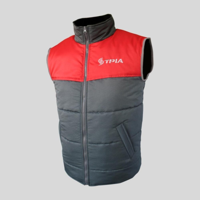 Жилет робочий утеплений "Майстер" виготовлений у двох кольорах: червоному та сірому. Він належить до стандартних моделей з горизонтальною строчкою та коміром-стійкою. Центральна застібка – блискавка, є дві прорізні кишені-листочки. Утеплювач – синтепон, підкладка – нейлон. Плечова зона має кокетку з червоної тканини.